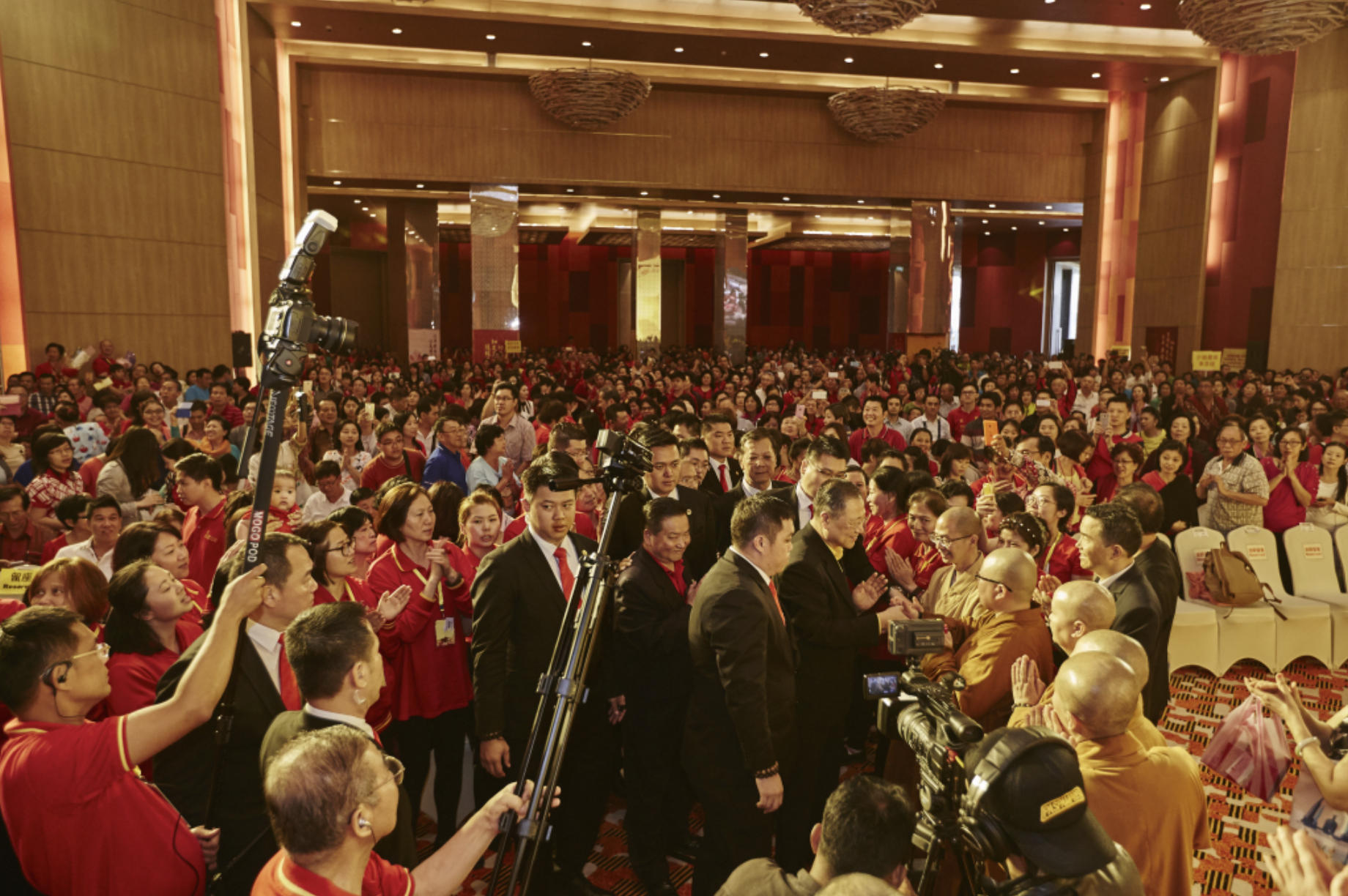 当天的法会在酒店的5层和27层分别设立了主会场和分会场,主席台及会场布置均呈现金黄色,金色佛山背景气势磅礴,映衬之下如在天上。会场外设有免费结缘处与咨询处,在早晨十点多会场外早已挤满前来认真咨询学佛念经的印尼当地华人,虔诚至诚之心令人赞叹。为法会准备的大量书籍更在法会开场前已被结缘一空。至法会开场前仍然陆续有印尼佛友到场,到场人数比原本计划的人数多出一倍,主会场和视频分会场均座无虚席,酒店所有座椅全部临时被移至现场增加座位。